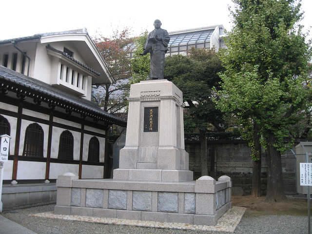 大石内蔵助の像 中門を進むと右手には大石内蔵助の像が立ち、左手には立派な山門が見えてきました。参拝順路に従って山門の右手を進み、泉岳寺の本堂に参拝。