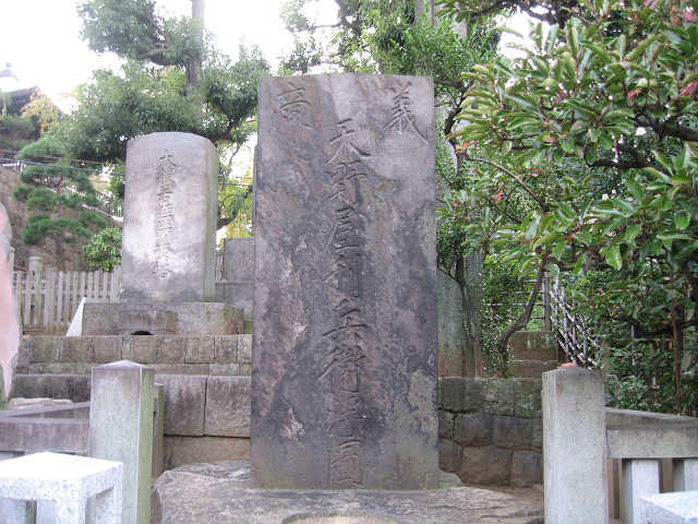 首洗い井戸 首洗い井戸の先には義商天野屋利兵衛浮図(ふと)の石碑が立っていました。この天野屋利兵衛は、赤穂浪士が討ち入りに必要な武器一式を取り揃えたとされ、「天野屋利兵衛は男でござる」と啖呵を切った話は有名です。