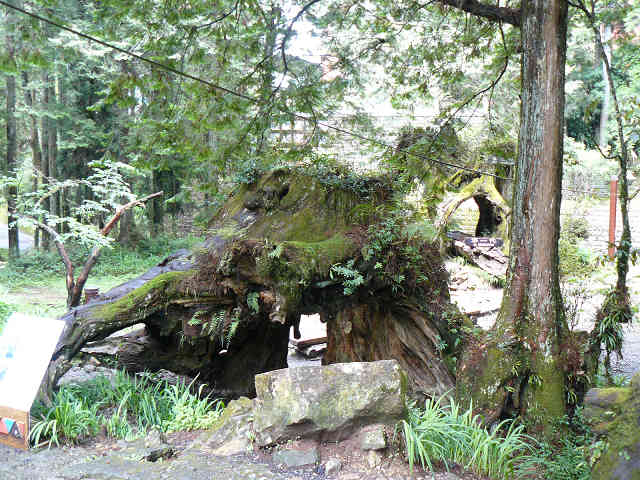 樹齢三千年の神木 森林鉄道を見送り再び森林浴を再開、着いた場所には千歳檜が立っている。これは樹齢二千年の紅檜。日本の統治時代は木の形が両手を挙げて万歳をしたときに似ていることから万歳檜と呼ばれたが、戦後樹齢が一万年に達していないことから千歳檜と改名された。
