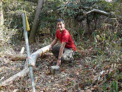 登山口まで引き返して坂を登ると、右にはイノシシ捕獲用の罠が仕掛けてあった。さて、切り開かれた道を快適に進む。周囲には倒木が多いものの、作業道は歩きやすいように最近整備されたように見えた。