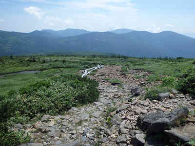 さて、リフト乗り場・西吾妻山の案内を確認して西へ続く道に入る。南にそびえる西吾妻山は、緩やかな傾斜の山に見えており、その手前中央付近には梵天岩らしき岩峰が青空の下に顔を出している。平坦な木道の左右にハイマツとしゃくなげを眺めながら進むと、すぐに左右の分岐へ着く。右はカモシカ展望台へ続く道で帰路に使ううため、西吾妻山へ向かって進路を左(南)へ採る。 整備された木道を下り、大凹湿原に入る。このあたりは美しいお花畑で、コバイケイソウ、チングルマ、ワタスゲ、イワオトギリなど珍しい花を眺めながら時間を掛けて散策する。やがて木道が終われば梵天岩へ800m地点へ到着、大凹の水場でのどを潤す。冷たい水で顔を洗って登山再開、ここで遅咲きのしゃくなげの花を観賞することができた。