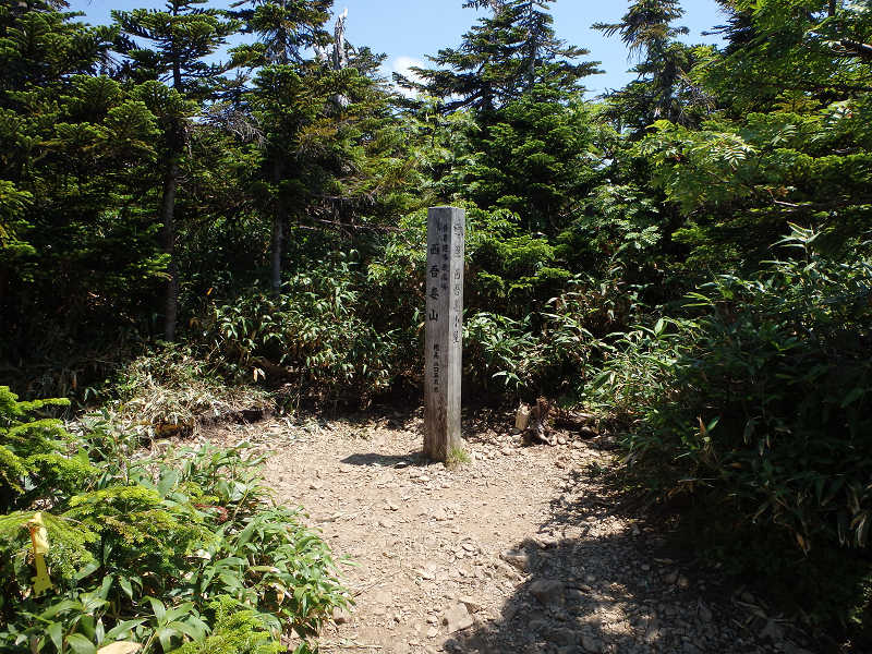 テレビで何度も紹介されている山頂の風景だが、実際に山頂に立つと緑に囲まれて展望の無いことがとてもうれしい。山頂にて小休止の後、下山を開始。下山は西へ進路を採り、西吾妻小屋を経由して天狗岩へ戻るコースを採る。