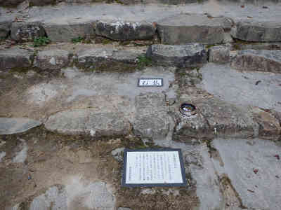 安土城入口へ 従って、午後5時の閉門までに下城しなければならず、少々慌ただしい登城となりそうだ。案内にも頂上天主まで登り石段405段、往復所要時間1時間と書かれていた。段差の大きい石段を登り始めると、すぐに左へ分岐する道を見る。これは下山時に三重の塔と仁王門を経て帰り着く場所である。