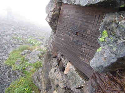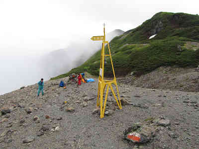 途中に眺める案内だけが道を間違えていないという証明であり、左に雪渓が見えてくると8時6分に間ノ岳の山頂に到着した。三等三角点の置かれた山頂には数人の登山者がおり、それぞれ記念写真を撮っている。我々も記念写真を撮り、周囲を眺めるが霧が深く何も見えない。