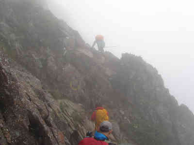 9時33分に農鳥小屋を出発、深い霧の中を足下に描かれた案内に従い進む。岩の点在する尾根道を辿れば、時折現れる雪渓に感激。南アルプスの登山道はとても素敵である。やがて平坦な道になり、安心していたらすごい風。今までに経験したこともないような強風に、身体ごと吹き飛ばされそうな、そんな難所を通過。
