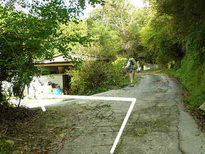 この道はやはり県道59号で、分岐から約800m弱進んだ付近で右の分岐に注意していると、古びた中電の巡視路標識が立っている。この標識の手前には「阿品2幹47」、少し西には「アジナ分77・阿品2幹48」の電柱が立っている。我々はもう少し西へ進み、右にカーブする地点の左側に少し広い場所があるので駐車した。なお、この横には十一丁の丁塚が立っているので目印となる。