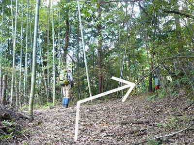 昼食後は弥山へ向かって周回をする。先ほどの阿品山手前の交差点まで戻り、西へ向かって延びている踏み跡をたどる。西へ向かって古いテープが残っており、足下に注意すれば、しっかりと道が続いている。途中の倒木などはご愛敬なので、やはり快適な道と言って良いだろう。