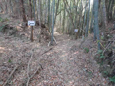 少し進むとベンチの置かれた休憩所へ着き、標識には山頂まで500mと案内されている。ここで進路が左へ変わるが、以前は直進したような気がする(直進は急登、左は巻き道)。案内に従い北へ進むと、しばらく平坦な道が続く。沢に架かる小さな橋を渡り、左に隠し田のような小さな平坦地が見えてくれば、折り返すように高度を上げる。