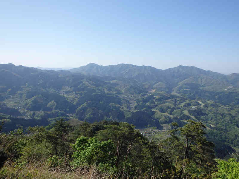 さあ、充分展望を楽しんだので、雨乞山へ向かおう。自然林を辿れば、この季節には三つ葉ツツジの鮮やかなピンクが美しい。明るい尾根道をたどると前方に植林帯が見えてくる。この植林帯を抜ければ、ススキの刈り払われた雨乞山の山頂である。山頂には三等三角点が置かれ、雨乞山の標識にはくまのプーさんが描かれていた。 山頂からは東方面に180度の展望だが、とても明るい山頂なのでこれで十分である。東には霰ヶ山の山頂部が顔を出し、大空山の山頂先から眺めた山を今度は反対側から眺めていることが、新鮮な喜びである。山頂に立つ枝振りの良い松を眺め、小休止を取った後、下山を始めた。 枝振りの良い松と 木の間越しの展望(クリックで拡大) 雨乞山は登山途中の展望が素晴らしく、山頂も明るい名山である。下山は元来た道を引き返すので美しい展望に感激を新たにすることができた。登山口まで引き返し、下湯原温泉のひまわり館へ立ち寄り、次の目的地の仏ヶ仙へ向かって出発した。