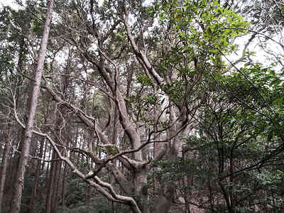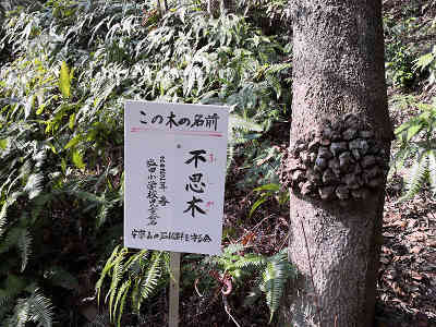 歩きやすい尾根道の途中で2本の巨木を過ごし、補助のロープに助けられて峠の作業道に下り立った。垰にも立派な案内が置かれ、磨崖仏まで約15分と掲示されていた。下山側には下山ルートとして「約1km15分」と案内されていた。