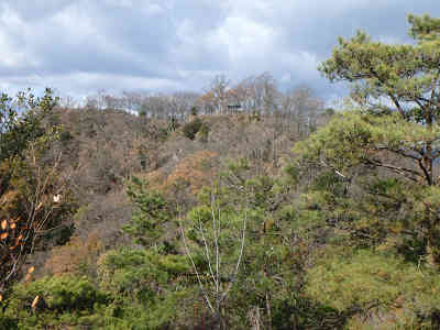 北西に青影山と山頂右側のピークに建つ東屋等を眺め、展望地から坂を下れば交差点へ着く。直進は青影山まで300m、右は県道まで1400m、左は田熊町と案内されていた。山頂へ向かって坂を登り返せば、すぐに東屋と村上義弘公青影城址登山路改修碑へ着く。