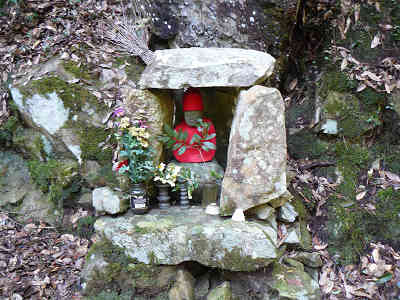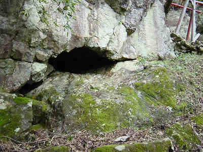 目の前を見ると苔むした岩があり、右手の中程に耳のような穴が開いており、説明の通り耳を寄せると耳が良く聞こえる気がした。この岩の上には観音像が祭られており、周囲には穴の開いた石が沢山供えられていた。 耳観音を出発、更にのどかな田園風景の中を進む。左手上の丘に南無阿弥陀仏の石塔を過ごせば、間もなく県道30号に着き左折、船鉄バスの「下荒滝」バス停を過ごし、厚東川を右手に見ながら北へ進む。旧道側には荒滝山登山口標識を過ごし、そのまま「荒滝」バス停・「上荒滝」バス停を通過する。