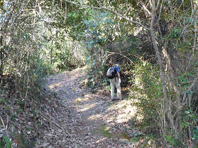 木漏れ日の射す登山道を進み、少し登った後すぐに下る。下った先は荒れた林道となり、林道を左に向かって進む。しばらく尾根道歩きが続き、途中で沢を渡り高度を上げて行く。間もなく小ピークに到着、久し振りの展望がとても嬉しい。展望地を過ごせば緩やかな尾根道歩きが続き、すこしほっとする。