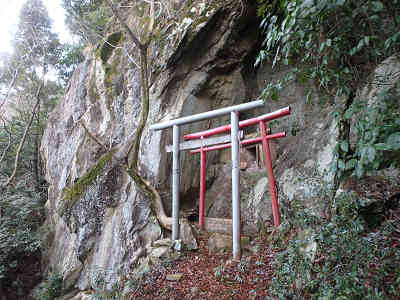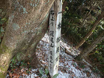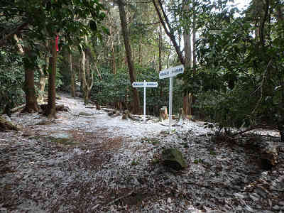 緩やかな傾斜の道で右カーブを描きながら進むと、朱の鳥居を潜る。山頂へ1kmの案内を過ごし、植林帯の下を進むと、すぐに荒滝集落方面からの登山道と合流する。この地点から少し進むと急登が始まり、山頂まで0.5kmの案内を通過、山腹にジグザグを描きながら一気に高度を上げる。