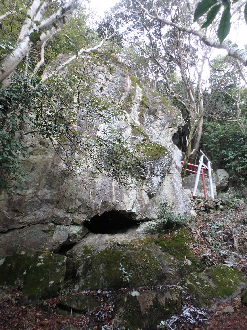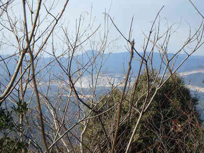 この像の下は手すりの整備された展望地で、阿知須方面、宇部市内、瀬戸内海等を見晴らす事ができる。本日は時折雪の舞う悪天候だが、きららドームははっきりと眺めることができた。山頂に向かう前にそのまま坂を下り、左に石積みを眺める。