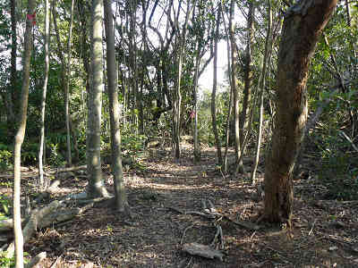 やがて、左右にシダが目立ち始めると、進路は急に右上へ向き、急な坂へ向かって直登する。急な坂へ立ち向かうので、手がかりの木をつかみ、足下が滑らないよう慎重に高度を上げれば、すぐに平坦な場所へ着く。