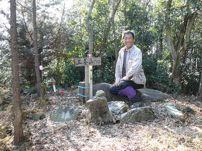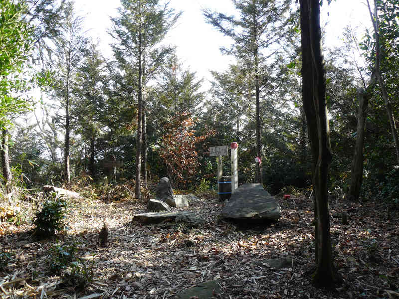 石祠と役行者・石鎚様・不動明王 大岩の右側を進むと、三条山の山頂標識と楠町の標識の置かれた山頂へ到着。平坦な山頂の周囲には木々の背が高く、展望は木の間越しである。山頂から北へも地積調査の切り開き(「谷間の道」と案内されている)が続いているが、どこまで続いているか分からず、山頂より元来た道を引き返す。