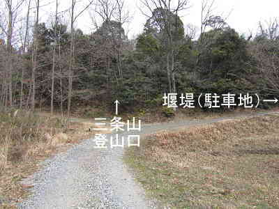 この先は未舗装道だが、よく踏まれているため、そのまま進入しても大丈夫。やがてY字の分岐へ着き、この分岐のわずかに左側が石段のある三条山登山口である。分岐の右へもう少し進むと、堰堤の手前に駐車地があるので車を置いて登山をすると良い。
