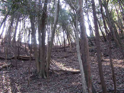 この付近が本登山中一番の踏ん張り処で、この坂を登り切れば、岩の多い尾根道へ着く。この岩のところで進路を左に採り、植林帯の下を進むと地積調査の杭と「村有林」の石杭が立っている。