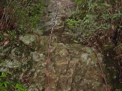 山頂に着いて初めて三つ目の鎖をとばしたことに気がついたので、山頂から一度道を降りて三の鎖場の位置を探したが、鎖場の位置が分からないので頂上から鎖を伝わって三の鎖場に降りてみた。