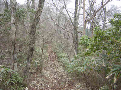 足下に沢を見ながら進むとすぐに坂が急になり、滑る道を楽しみながら登って行く。途中では20名程度のパーティに遭遇し、坂も急だしすれ違うのにも難渋した。山頂への距離や時間などもある程度分かっているので急な滑る坂も苦痛にならず、時々眼下を振り返りながら高度を上げて行く。