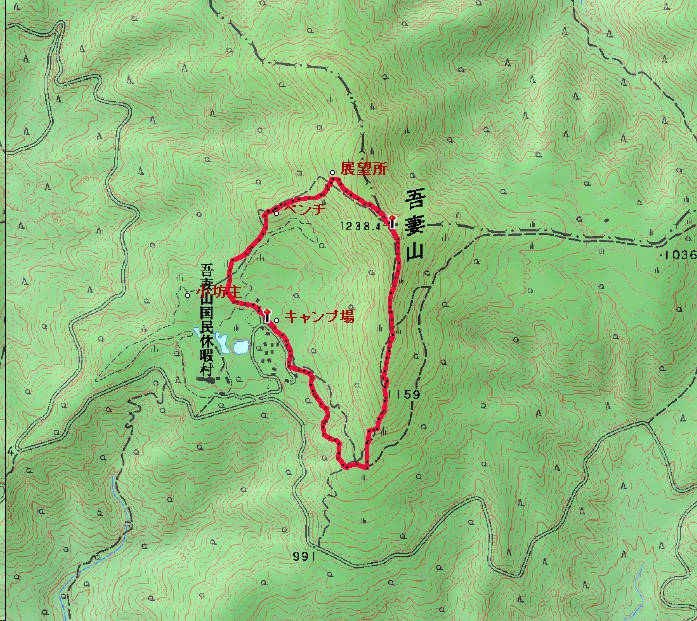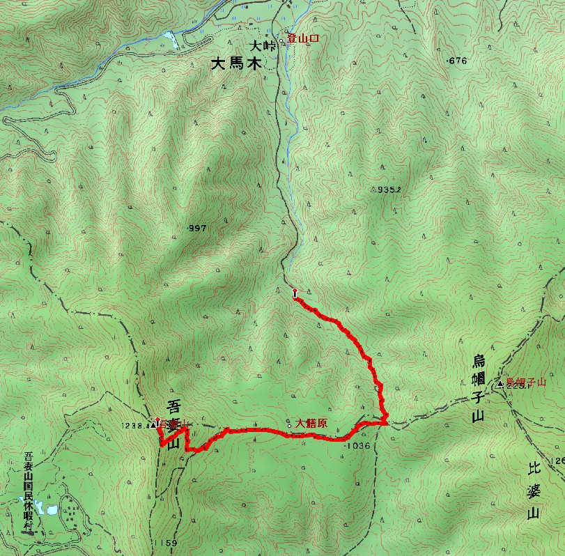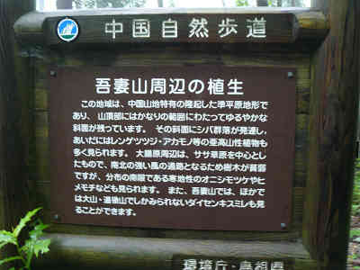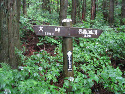 林道終点登山口 →0:25→ ベンチのある鞍部 →0:20→ ブナ林入口 →0:20→ 吾妻山 →0:15→ ブナ林出口 →0:20→ ベンチのある鞍部 →0:20→ 登山口 全歩行時間 2時間 0分 朝5時に空を見ると雨は降っていないが曇っている。天気予報では梅雨前線が日本海から南下し、中国地方の山陽側は雷雨となる予想。ただし、天気予報はこれまですべて裏目なので本当に雷雨になるかは怪しい。しかしながら梅雨前線の間隙を縫って登山をしようと言うのは少々虫のよい話かもしれない。 本日は天気予報がまたはずれることを願って出発。案の定、瀬戸内海の西の空には晴れ間も見えており、四国・九州の陸地がくっきりと見えている。今回は久しぶりに山口県百名山の著者、中島先生と一緒に吾妻山へ向かう。岩国から高速道路に入ると空が暗くなってきた。やはり天気予報通り梅雨前線は南下しているようだ。 広島ジャンクションを過ぎて中国道へ向かっていると間もなく雷雨となり、大粒の雨がフロントガラスをたたき始めた。丁度梅雨前線の下を通過しているようだ。これを通過すればいずれ晴れ間が出るはず。そのまま中国道に入り、庄原インターで高速道路を下る。庄原市街から芸備線沿いに国道183号を走り、備後西城・比婆山駅を過ごし、備後落合の手前から国道314号に入り、出雲横田に向かって進路を採る。なお、今回の吾妻山へは島根県側のコースを採る。 県境を越えて島根県に入り三井野原高原を通過、懐かしいおろちループを通る。八川駅付近から進路を西に採り、県道49号を馬木へ向かう。南には大きな仏山が聳えている。馬木川を渡り交差点を左折、県道25号を大馬木から吾妻山の登山口の大峠に向かう。