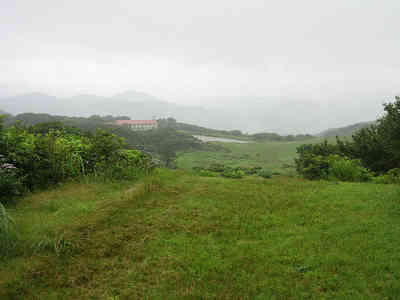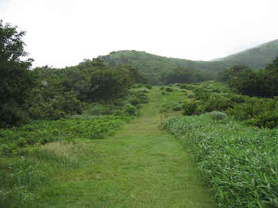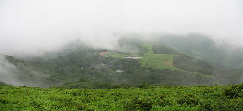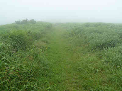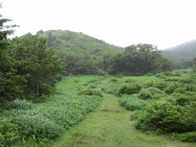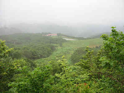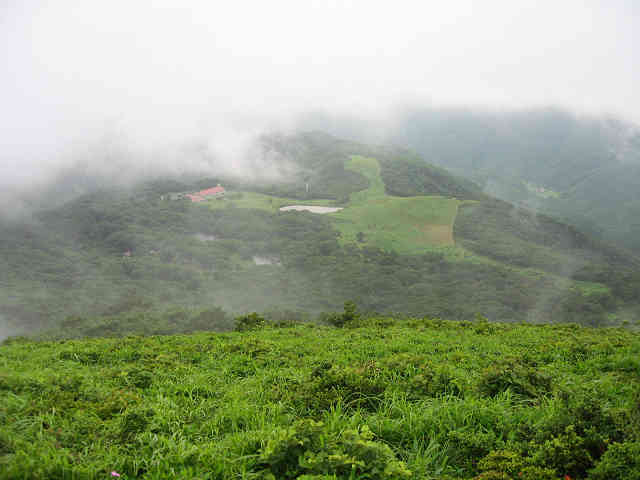 草原のお花畑は後でゆっくり楽しむことにして吾妻山に向かう。草原につけられた刈り込まれた道を少しずつ進んで行く。吾妻山方面には相変わらず霧が掛かっており展望は無い。しかしながら背後の休暇村方面にはとても素晴らしい展望が広がっている。
