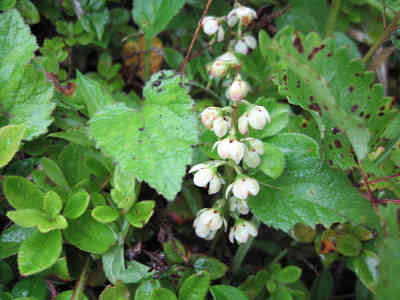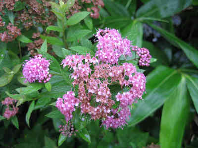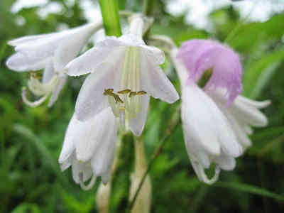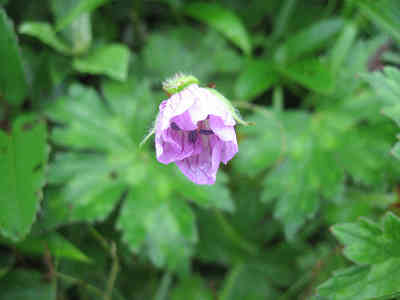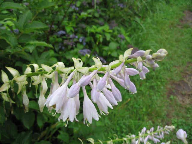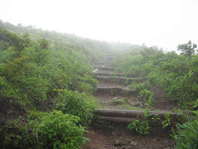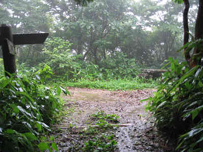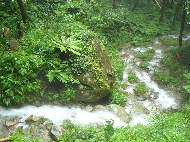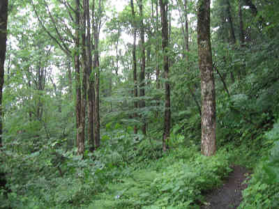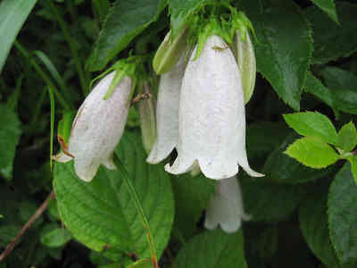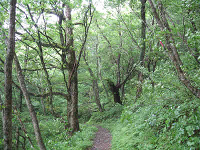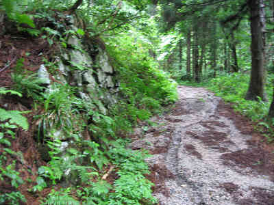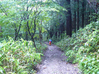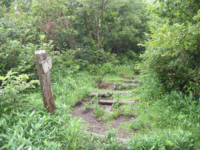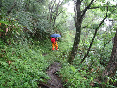 更に5分で樹林の中に入り、大膳原への分岐に着く。吾妻山からは1kmを下りてきたことになる。更に2分で左手に車滝の分岐を見る。時間があるので車滝に向かおうとしたが、再び雨が降ってきたので途中で引き返すことになった。この付近はホタルブクロ群生地のようだ。