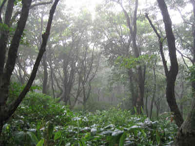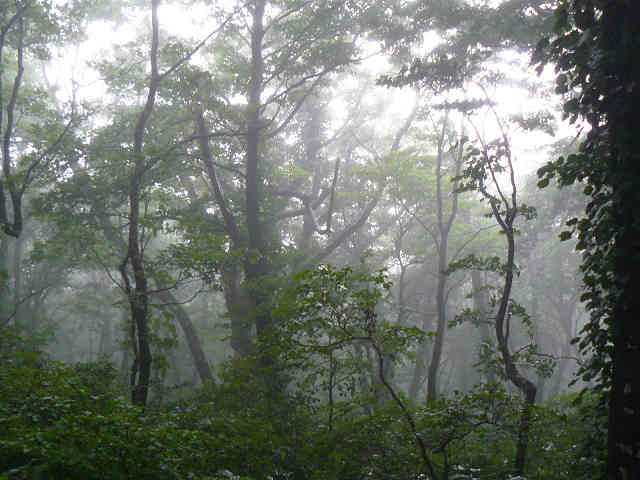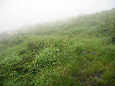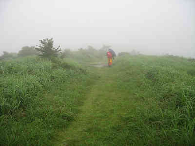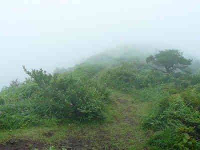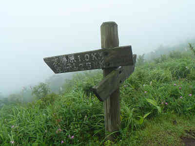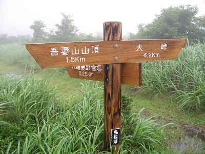 吾妻山 登山開始→8:40→山頂到着→9:26→山頂出発→9:53→登山終了→10:53 登山開始→0:46→吾妻山山頂→0:50→登山終了 全歩行時間 1時間36分 昨日中に島根県の地倉沼から吾妻山キャンプ場に移動した。 朝起きると大雨、まだ6時過ぎだ。天気の回復を期待してもう一眠りする。7時になり少し小降りとなっている。吾妻山の山頂方向には霧が掛かっており、とても展望が望める状態ではない。 しまった!、天気予報は完全にはずれた!、午前中さえも天気は持たなかった!。残念ながらこんな天気の中で日本三百名山の一つ吾妻山に登るのは勿体ない。早々に登山を諦めて帰ることにした・・・・。とは言ってもせっかくここまで来たのだから周囲だけでも散策しようと池原方面に向かう。