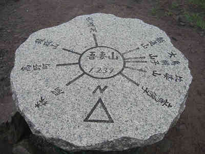 休憩所のベンチを過ぎて15分で、比婆山方面を見る展望所らしき所に着くが周囲は霧が深く何も見えない。更に10分の階段登りの後、吾妻山山頂に到着した。