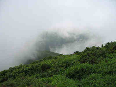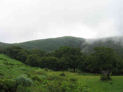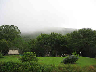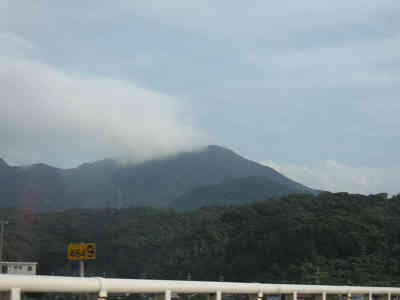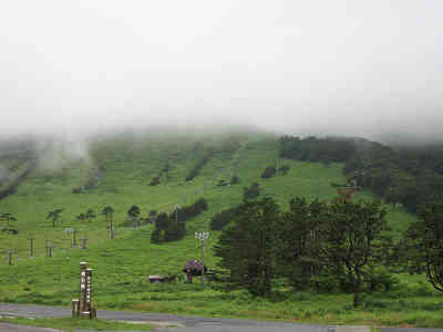 吾妻山の山頂を眺めると少しずつ霧が晴れており、とうとう山頂の標識を麓から確認することができた。ああ、今山頂から眺める景色は素晴らしいだろうなあ・・・と先ほどの展望を思い出しながらキャンプ場の駐車場に戻り、山頂を見上げていた。 名残惜しいが吾妻山を出発することにして、車に向かっていると、突然滝のような大粒の雨が落ちてきた。急いで車の中に入ったが、ずぶぬれ状態だ!。これでは道後山に行くわけには行かない。とりあえず浜田市の大麻山に向かって一般道を走ることにした。
