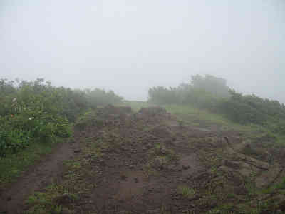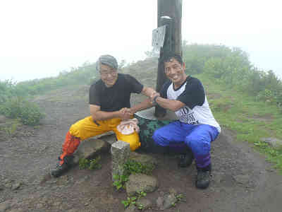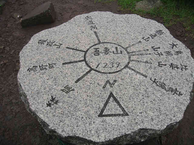 山頂には周囲を遮るものは何もなく、360゜の大展望のはずだが何も見えない。山頂には山頂標識の他に周囲の山々の案内盤が埋め込まれており、比婆山連峰・大山・船通山・猿政山や宍道湖の方向が示されている。 山頂より山の先輩に無事山頂に着いたことを報告していると一瞬目の前の霧が晴れ、登ってくる登山者の姿が見えた。急いで写真を撮るが1枚シャッターを押したところで展望は霧に隠れた。