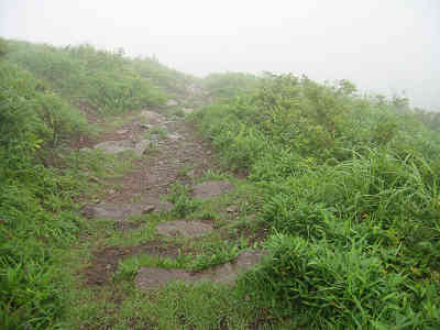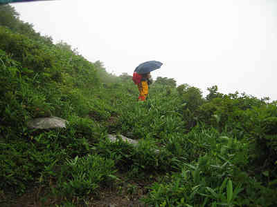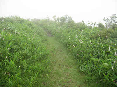 薄い霧の中をゆっくりと下りて行くとまたまた白いお花畑が広がっている。白イブキトラノオは風に吹かれて左右に揺れておりとても美しい光景が広がっている。ゆっくり・ゆっくり歩きで10分を過ぎると急な坂を下りることになる。