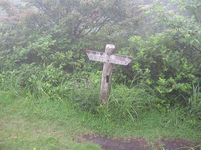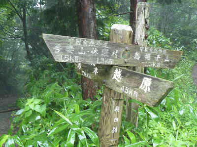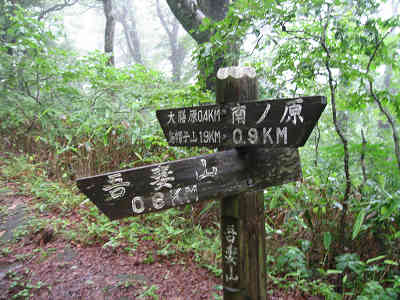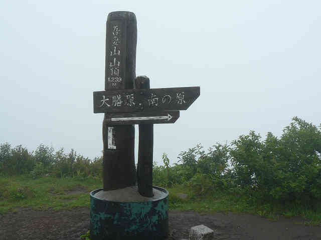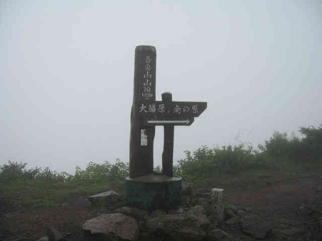山頂標識と山頂の石板 周囲に咲く花を観賞しながら下りて行き、ブナ林の中を歩いていると突然雷鳴が轟いた。雷だ。この先の大膳原には隠れるところがない。大事を取ってブナ林の中で雷が通り過ぎるのを待つ。しばらく幻想的なブナ林の中で待機し、雷が遠くに過ぎた事を確認し出発。ただし、大膳原を走るように進み、雷がなる前に鞍部を目指す。ところが、半分程度進んだところで、しばらく鳴りやんでいた雷の音が遠くに聞こえた。これには飛び上がったが、更に急いで鞍部に到着、無事大膳原を通過した。