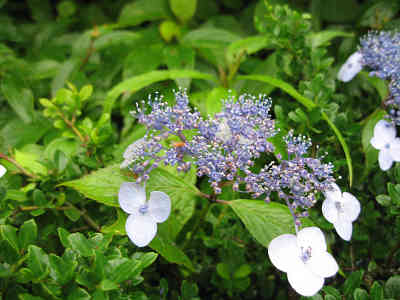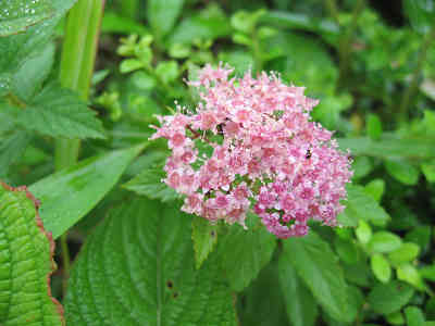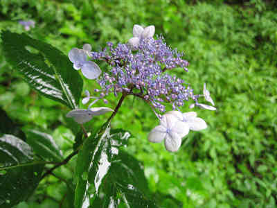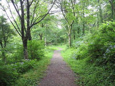 丁度12時に登山口を出発、まだ小雨が降っているので傘を差して歩き始める。整備された広い登山道をゆっくり進めば、道ばたに咲くあじさいが雨に濡れて、とてもよい雰囲気だ。すぐに吾妻山まで2.2km標識を通過、左手に石垣の組まれた場所を見る。この場所には昔は畑があったのかもしれない。