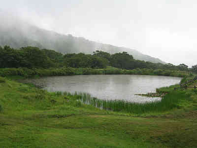 霧の草原も素晴らしいものだと、もう霧に隠れた山頂が気にならなくなっている。小坊主から南方面には原池が美しい。原池の端っこにはスイレンの花が咲いておりとても綺麗だ。最後に原池から小坊主を眺め、草原を後にする。