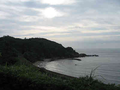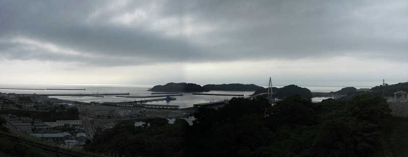 ゆうひパーク浜田から日本海の展望 国道9号に戻り浜田市に着き、ゆうひパーク浜田で休憩、おみやげを買って出発、途中では名峰大麻山を仰ぐがこの付近も雨が降り続いており、山歩きのできる状態では無い。ゆうひパーク三隅で休憩、今の時期の夕陽を見るなら浜田の方が良いようだ。