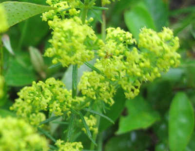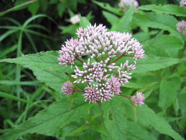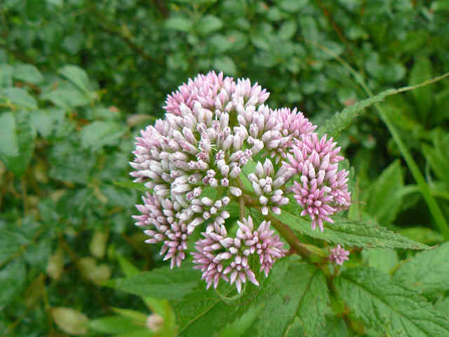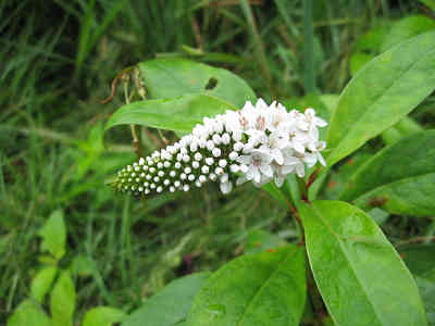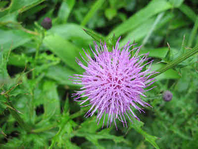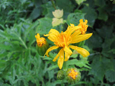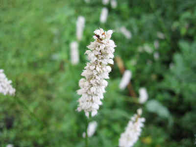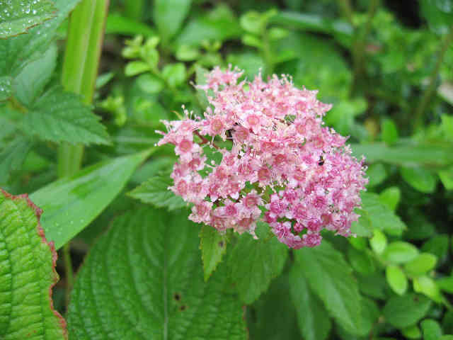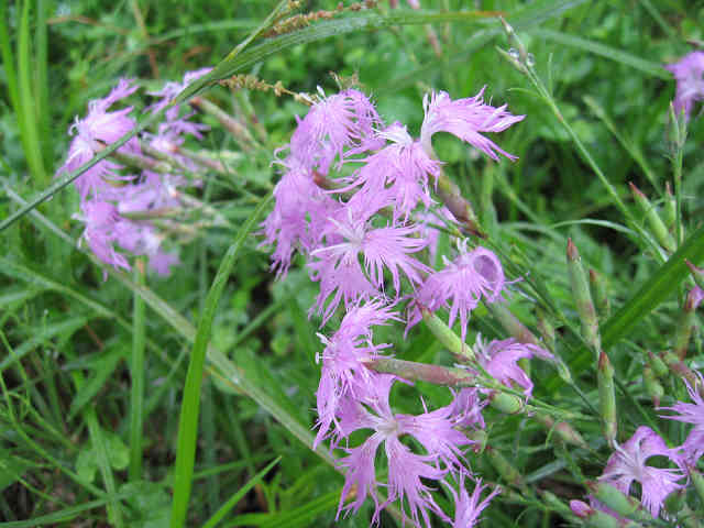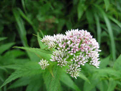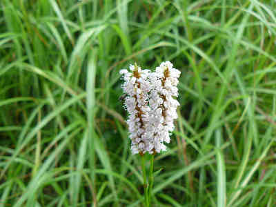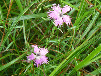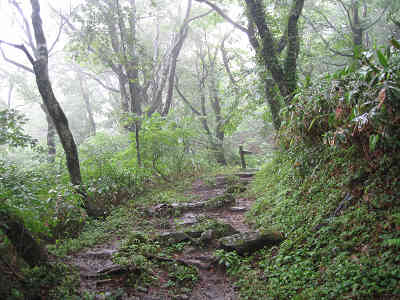 分岐の標識から5分でベンチのある休憩所を過ぎる。このあたりで背後の休暇村方面に霧が迫ってきた。相変わらず山頂方面に展望はなく、周囲の花を楽しみにゆっくりとお花見が続く。