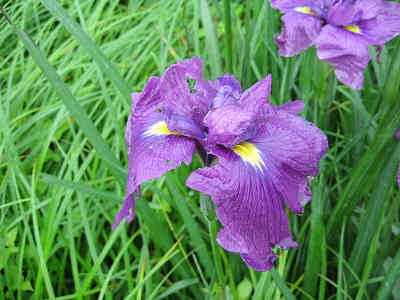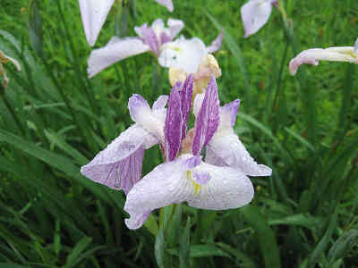 アヤメ 池原には沢山の花・花・花、花の名前が分からないのが本当に残念だ。草原の花を求めて散策していると雨が降ってきた。傘を差しながらいろいろな花を楽しむ。草原の端にはアヤメも咲いている。吾妻山の標識を見てハッと我に返る。