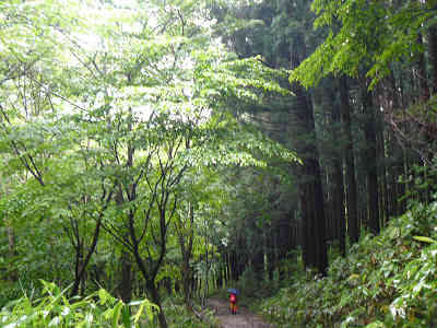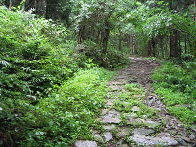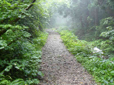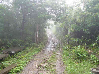 雨に濡れた砂利道のような登山道を滑らないよう進む。小川はやはり水量が多く豪快だ。先ほどの標識から200m距離を稼ぎ、もう大膳原までは400mの案内標識を過ごす。中国自然歩道の案内に励まされながら歩いている。