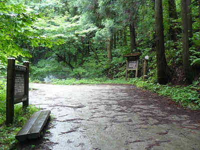 すぐにトイレの整備された吾妻山登山口が現れるが、本日は雨の心配もあるのでそのまま終点まで車で進入する。終点には登山コースの案内図があり、これから歩く行程を確認。雨が降り止まないので先に昼食を摂る。登山口を流れる川は折からの雨により増水しており、とても豪快な景色が広がっている。
