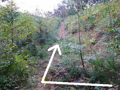 ガードレールの切れ目の登山口に入れば右側へ向かって急登が始まるので入口から3ヶ所ほどロープを配置しておいた。これで登りやすくなったはずである。このロープを3つ使えば山仕事の道に出る。足下は狭いので慎重に歩を進める。