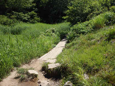 木道の整備された道を辿り、湿地帯を過ごすと裏磐梯登山口からの道と合わさる。なお、この地点は八方台登山口から1.2km、裏磐梯登山口からは4.6km地点で、八方台登山口から出発すれば、山頂までとても近いと言うことがわかる。さて、この地点から水場のある弘法清水までは1.6km、岩の多い登山道に入る。