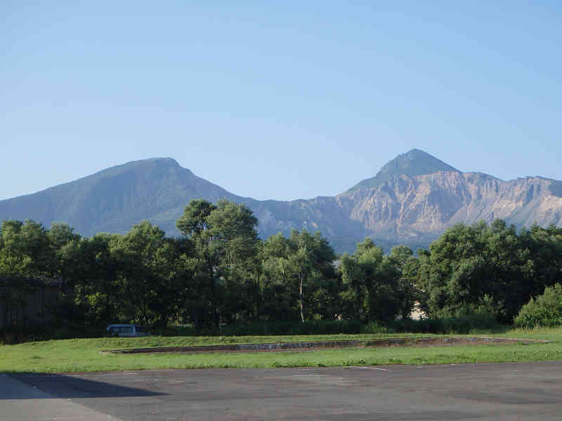 麓から眺める磐梯山 この登山口は磐梯町側に位置しているが、わずかに北へ入ると北塩原村である。午前5時20分に八方台登山口を出発、すると「6月14日正午頃磐梯山の登山道で人がクマに襲われる事故が発生した」と、注意書きが掲示されていた。そこでクマを除けの鈴を取り出し、ガラガラとうるさい音を鳴らしながら登山道を進む。