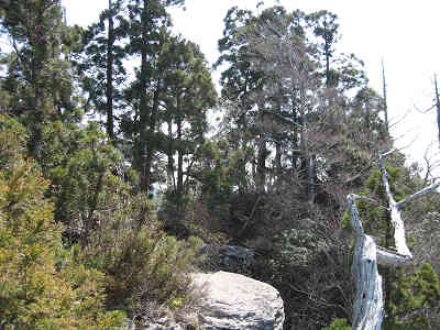 この付近には木々の障害物が多く、慎重に歩かないと怪我をしてしまいそうだ。はやる気持ちを抑えてよく写真に掲載されている場所に到着、この場所が大神ヶ岳の山頂なのだろうか。立ったまま枯れた木が岩の上にあり、とても特徴的な場所である。立って千年、朽ちて千年、倒れて千年は少しオーバーにしてもこのような木は朽ちても美しい。