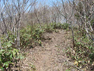 縦走路はよく踏まれており、目印もしっかりしているので初心者の単独行でも迷うような心配もなく、緩やかな坂を下りてゆく。鞍部付近にはまだ雪が残っており、この周辺の山が西中国山地の千メーター級の山であることを実感する。また、縦走路周辺には島根県の地籍標識が真新しく設置されており、道に迷っていないことを確認することができる。