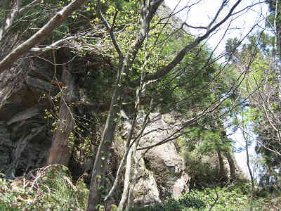 さあいよいよ大神ヶ岳を下りることにする。分岐の道標に戻り道を左に取り、岩の道を慎重に下りて行きながら懸崖を見上げる。一度山頂に登ればその場所が分かるのが嬉しく、下から眺める山頂の枯れ木を確認できるのが更に嬉しい。あの枯れ木の側にいたんだ、あの岩の間からのぞき込んだ場所に今自分が居る。再び感動が蘇ってくる。 懸崖を見上げて喜びを噛みしめながら更に下山を続ける。すぐに三坂大明神の社に到着、登山の無事を報告して岩場を下りて行き、その先の潜り岩を抜け、平坦な道を進み山葵天狗社に到着、社に登山の無事を報告して岩場を下り、平岩を過ぎるともう周囲は杉の植林帯だ。 右手に山桜を眺め急な坂を降りると平坦な道に着き、左に少しカーブして特徴ある橋を渡り、杉の植林帯を下りて行く。最後に急なジグザク道を下りて行くと大神ヶ岳の鳥居の立つ登山口に到着、登山を終了した。