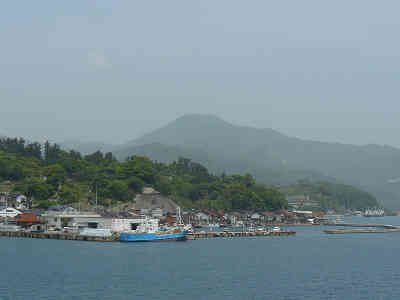 午前11時を過ぎると北に陸地が見えてきた。海に浮かぶ小さな岩場の上には沢山の釣人が見えている。隠岐まで釣りに来る人はとても多く、今日も釣竿とクーラーを持って乗船する釣人を沢山見かけた。11時25分にフェリーはおき西郷港に到着、レンタカーを借りるため「おき西郷港フェリーターミナル」前の指示された場所に行き、レンタカーの手続きを終了、いよいよ今回の旅の第一目的である隠岐最高峰の大満寺山に向かう。 おき西郷港に入港 西郷港から眺める大満寺山