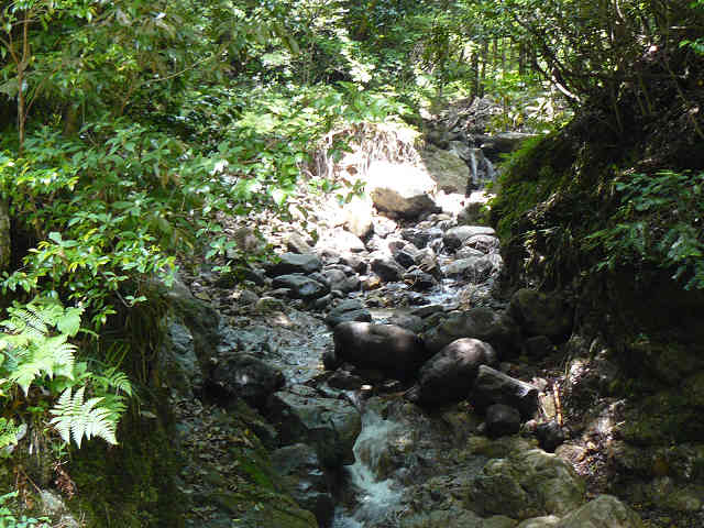 周囲に美しい滝を眺めながら荒れた林道を進んで行くと、広場を出発して10分で自然観察モデルコースbP9の標識が立つ広場に到着した。この先は沢歩きのコースみたいだ。あれ・・・・・!、これは参道コースではない。しまった、参道コースの登山口を見落として、遠回りをしたようだ。