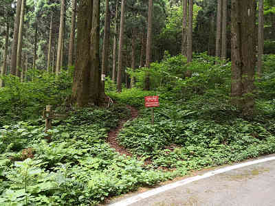 さて、大満寺登山を始める。乳房杉から少し下った所で南へ向かう登山道入口に出会う。大満寺山0.9kmと案内されているので間違えることは無い。なお、この登山道は15年前にもこの地に設置されていた。登山道に入り周囲に杉を眺めながら少しずつ高度を上げる。時折草の茂る場所もあるが、総じてよく踏まれており路に迷う心配は無い。
